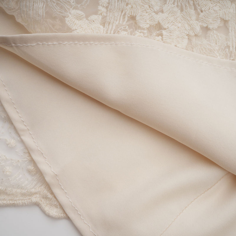 If the fabric needs a touch-up, use a very low-temperature iron on the inside, ideally with a protective cloth over the embroidery, or just use a steamer for a safer option. The lace responds beautifully but doesn't tolerate extreme heat.